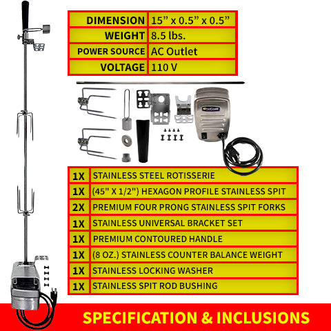 This is a heavy-duty corded rotisserie attachment kit that comes with a powerful 110-volt electric motor, 2 premium spit forks, contoured handle, and 37-inch long stainless steel spit rod.